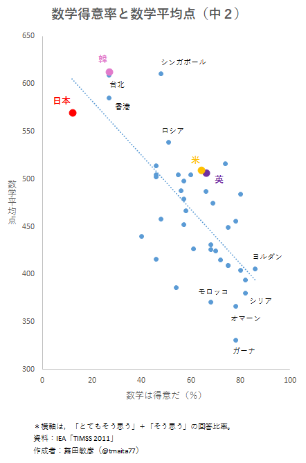 この指標を横軸,数学の平均点をとった座標上に,調査対象の42か国を配置すると下図のようになります。最新の「TIMSS 201」のデータをもとに作った図です。