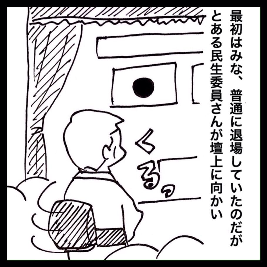 最初の5〜6人は普通に退場していたのですが、民生委員さんの1人が壇上の方に振り返り、一礼をして退場しました。