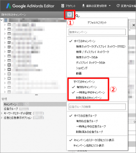 AdWords Editorの「管理」のセクションに、フィルタがありますので、キャンペーンで設定した項目のみを確認したい場合には、①フィルタをクリックし、②「空のタイプを非表示にする」をクリックすることで設定されている項目のみ表示ができます。