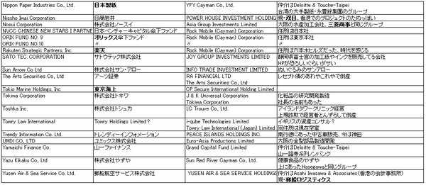 電通、JAL、オリックス、バンダイ、ドワンゴ、大日本印刷、ダイソー、セコム、 楽天、東京海上、丸紅、日本製紙、ソニー、ユニクロ、日本郵船、やずや、大和証券、ドリームインキュベータ、ジャフコ、石油資源開発、三菱商事、商船三井、双日
