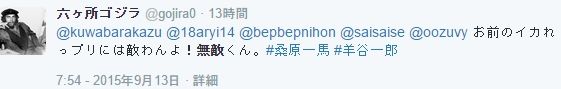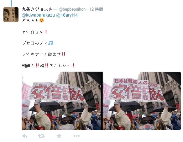 この九条クジョスルー@bepbephihonとかアリィー@18aryi14とかこういち@kouichi19690413とか六ヵ所ゴジラ@gojira0とかは氷山の一角にすぎません。こう言う人に出会ったら、いかに論理的に論戦を仕掛けても無駄です。最後には在日認定されて(もしくは最初っから在日認定されて)、ただ差別的な発言を繰り返されて、何にもならずに時間を空費するのがオチです。こう言う人をみたら、「ああ、世の中には可哀そうな人がいるなあ」と考えて、無視することにしましょう。議論は最低限デマをデマだと認められる人を相手に行いましょう。