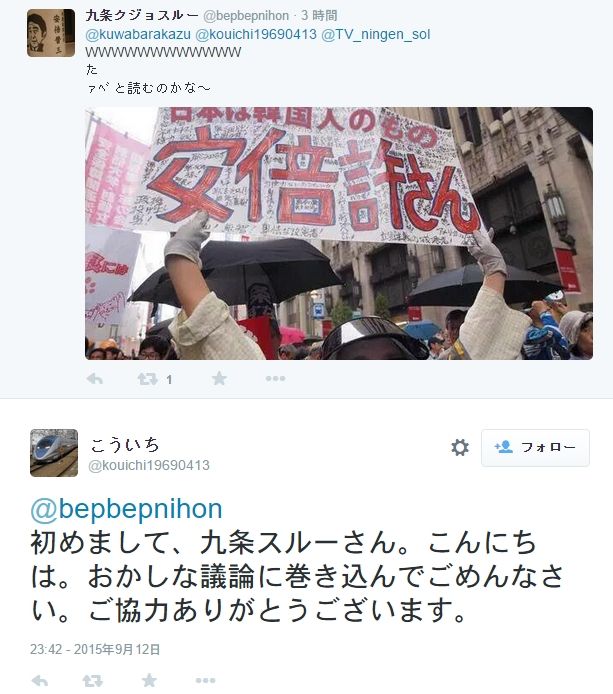 前回の記事で「安保デモに参加すると社会的に抹殺される」というデマを飛ばしていたこういち@kouichi19690413という卑怯な嘘つきを紹介しましたが、この人物、このデマ画像をツイートした九条クジョスルー@bepbephihonに対し、私がこの画像のデマを指摘した後で、こんなことを言っています。(本人のツイート)