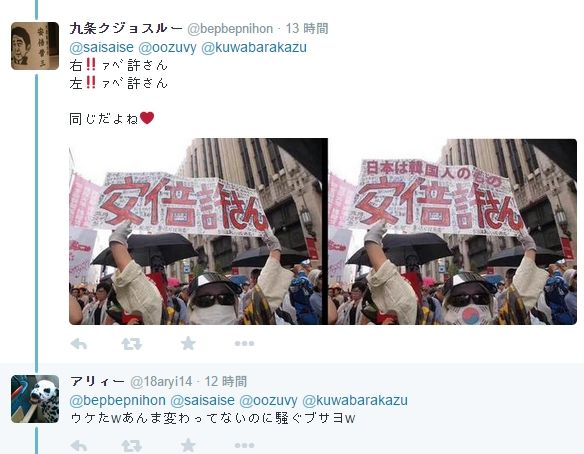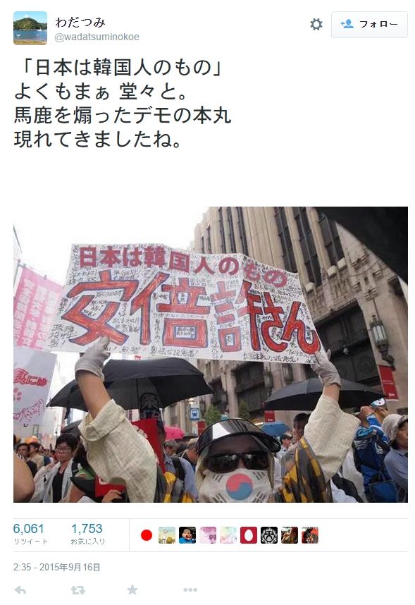 「自分の意見=日本の意見」だと思い込んでいる愛国カルトの中には、自分と対立する意見の持ち主、例えば安保反対派を日本人扱いしない人がいます。その中には、こんな卑劣な画像を用いる者までいるようです。