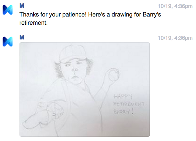 野球チーム、サンフランシスコ・ジャイアンツのバリー・ジト投手の引退をお祝いしたいとMに頼んだら、人間には連絡を取れないと言われた。そこで、ジト投手に「引退おめでとう」と書いた絵を描いてと頼んだ。