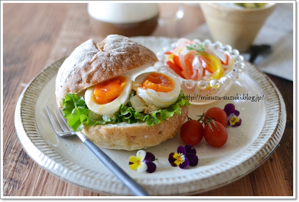 石窯パンに、リーフレタス、半熟ゆでたまご、ポテトサラダを挟みました。