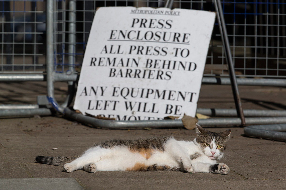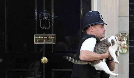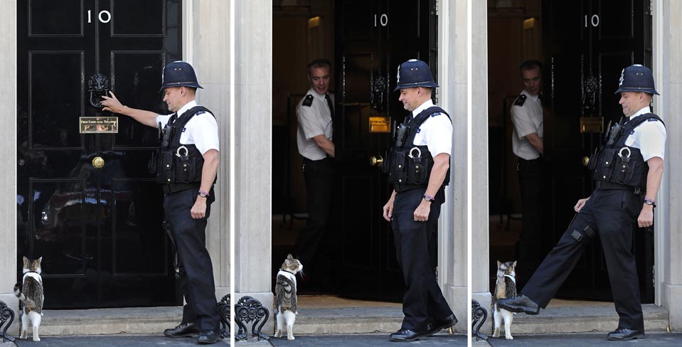 Palmerstonの仕事はネズミを捕まえることのほか、各国からの来客へのあいさつや、近所の首相官邸に住むLarryとの交流も。