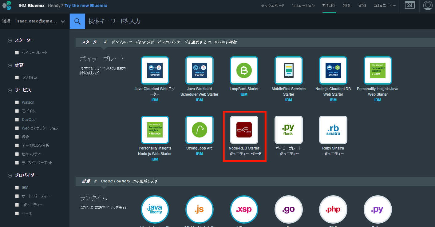 次に、アプリケーション本体を作成します。Bluemixにログインし、カタログ画面から「ボイラープレート」の中にある「Node-RED Starter」を選択します(画面3)。