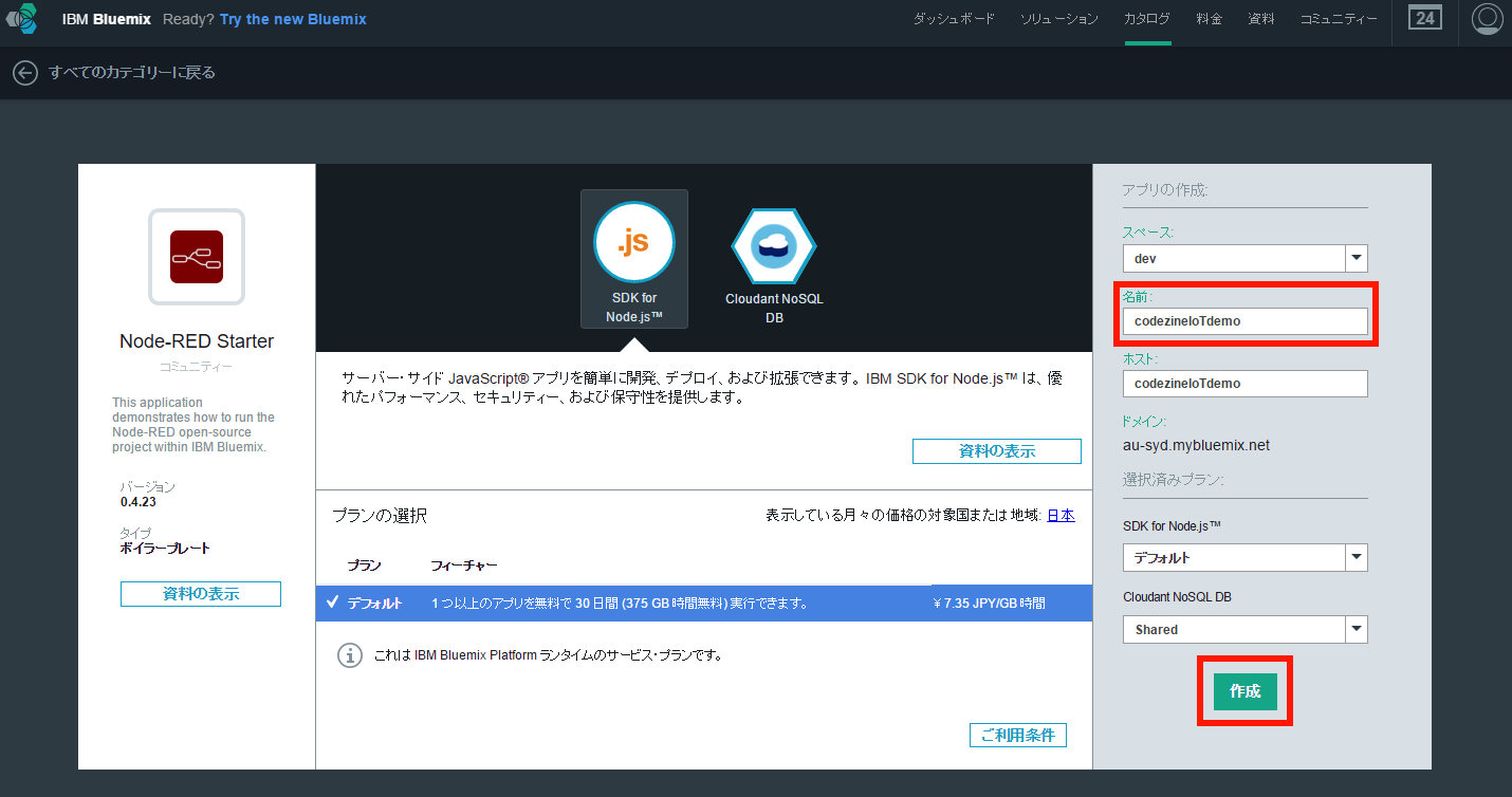 Node-REDアプリ作成画面にて、アプリケーションの名前を指定します。この名前は後にアプリケーションを公開する際のURLになります。なお、画面中央を見ると、開発SDKとして「Node.js」、データストアとして「Cloudant NoSQL DB」が利用されていることがわかります。名前を入力したら「作成」ボタンを押します(画面4)。
