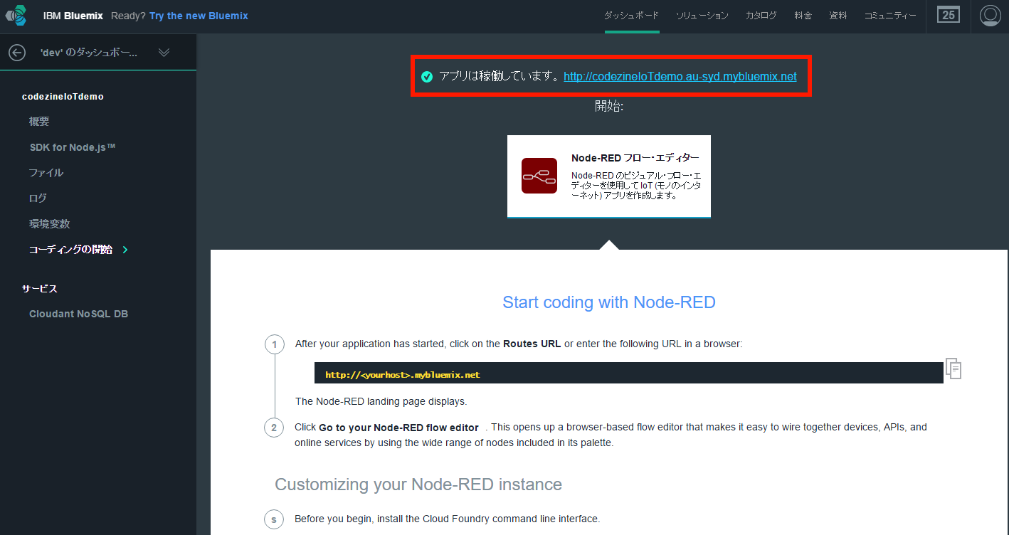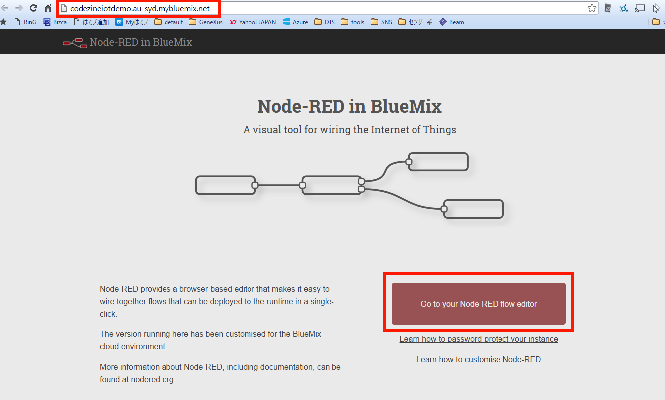 すると、別ウィンドウでアプリのデフォルト画面が表示されます。ブラウザのアドレスバーを見ると、自分のアプリケーションのURLとなっていることがわかります。「Go to your Node-RED flow editor」をクリックしてください(画面6)。