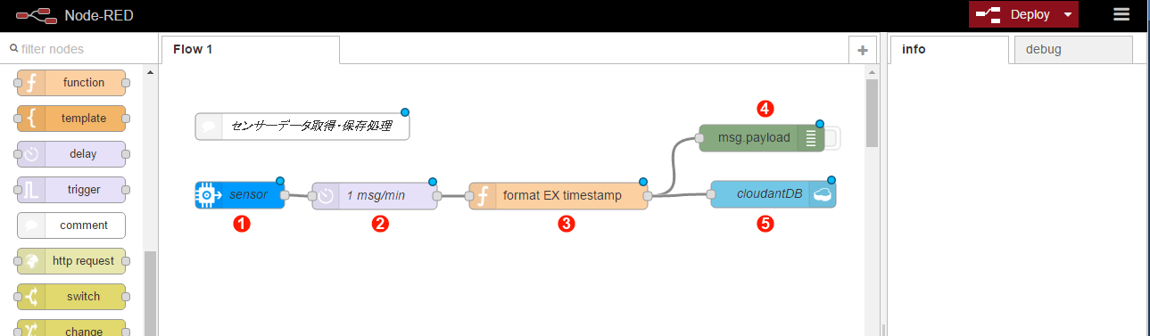 なお、本記事のサンプルファイル「codezine_iotdemo_nodered_app1.json」を使って、フローエディターにフローをインポートすることもできます。インポートの方法も同じく本連載第2回をご覧ください。