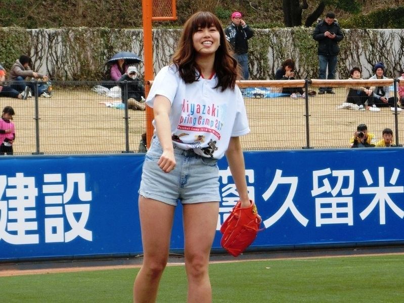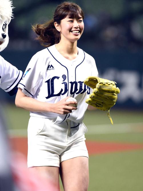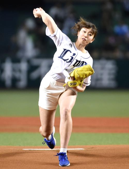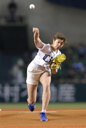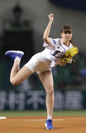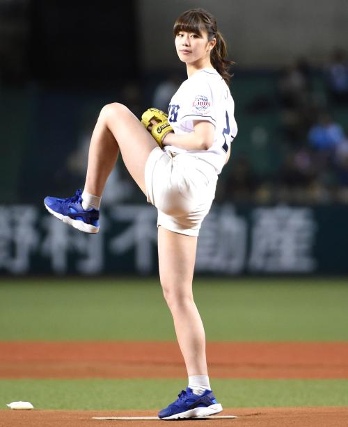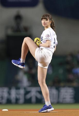 【話題】「神スイングCM」で話題の稲村亜美、短パン美脚始球式 98キロのストレートを陽岱鋼が打ち返す
