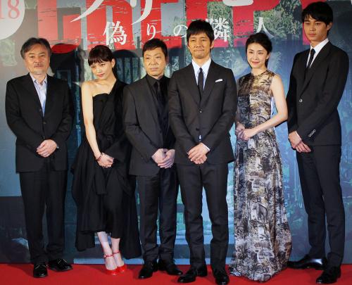 ・映画「クリーピー」ジャパンプレミアに登壇した(左から)黒澤キヨシ監督、川口春奈、香川照之、西島秀俊、竹内結子、東出昌大