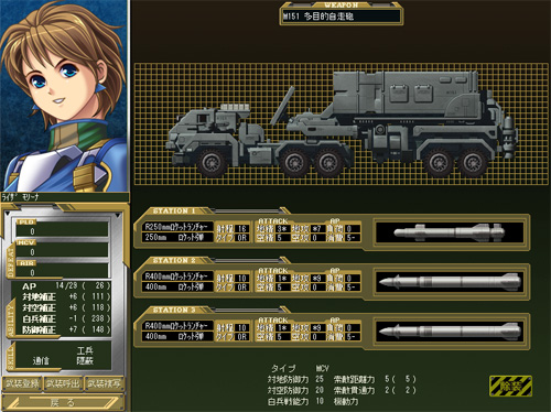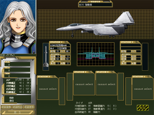 作戦にあわせた乗機(パワーローダー、支援砲、輸送機、戦闘機)とその武装を選びます。 ローダーには、汎用型であるX3Aを先頭に、白兵特化型のX3AC、索敵特化のX3ARなどがあり、また輸送機にも通常機と強襲機があり、作戦にあった乗機の配分、部隊内でのバランス、そしてそれぞれの特性を持つスキルの隊員をどの乗機に乗せるかを、見極めて選択しましょう。 勿論、武装の選択も作戦や部隊バランスを考えて行う必要があります。