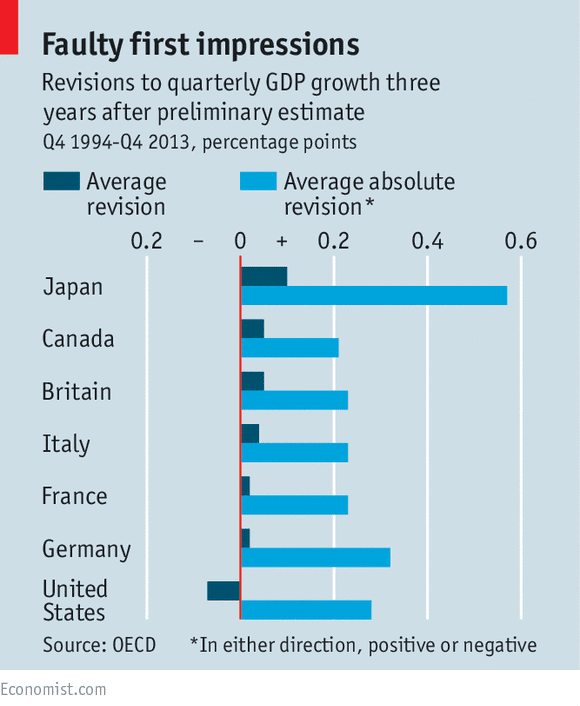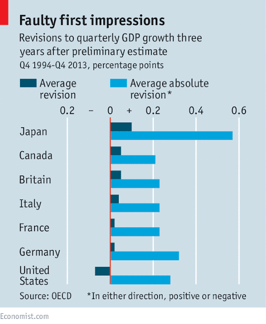 薄い青は、GDPの改訂幅の絶対値の平均を示している。言い換えれば、改訂の標準偏差を示していると考えればよい。面白い(というか面白くないが…)のは、日本の改訂幅がダントツに大きいということである。ほかの国は大体速報値と確定値の差は0.2%ほどなのであるが、日本だけは0.6%に近い。GDPの速報値が経済政策等に与える影響を考えるとこれはとても大きな問題だ。また、日本のGDPの速報値だけが特に早く公開される(つまり速報値を計算する際の情報が他国に比べて少ない)という話は聞いたことがないので、単純に考えれば、日本のGDPを計算する関係省庁の能力が足りないと考えることもできる。それにしても0.6%というのは大きい。ただし、この表の「GDP成長率」は年率換算なのか否か良くわからない。Economistの本文を読んでもわからなかった(この辺はきちっとして欲しいところだ)。例えば日本の最新(2015年第4四半期)のGDP成長率はマイナス前期比0.4%(年率換算でマイナス1.2%)だけれども、0.6%もずれれば四半期ベースだったらプラスに転じる可能性も十分にあり、年率換算でもマイナスの幅が半分になる可能性も十分あるということである。