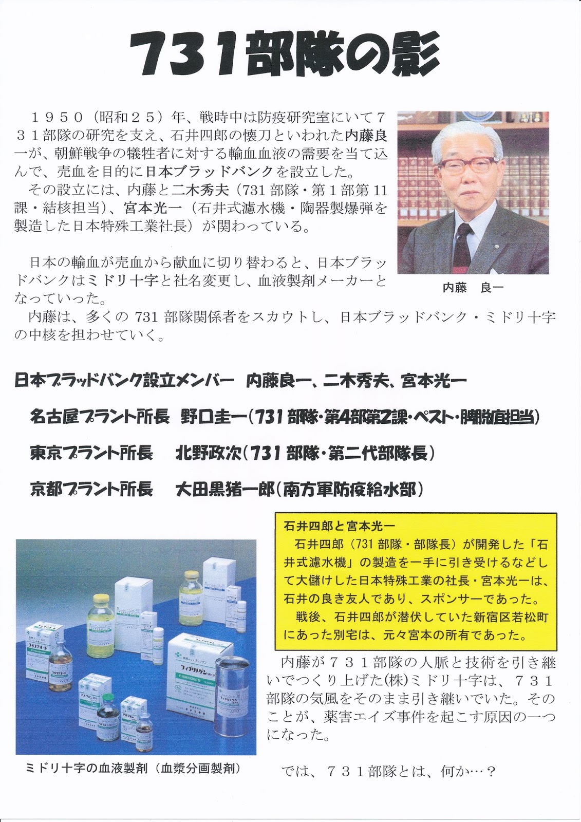 ・元731部隊員の内藤良一が作った会社「ミドリ十字」が薬害エイズ事件を起こした。