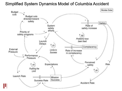 安全分析で著名なMITのナンシー・レブソン教授が、スペースシャトルコロンビアの事故をモデル化した図がこの図だ。(出典はこちら)