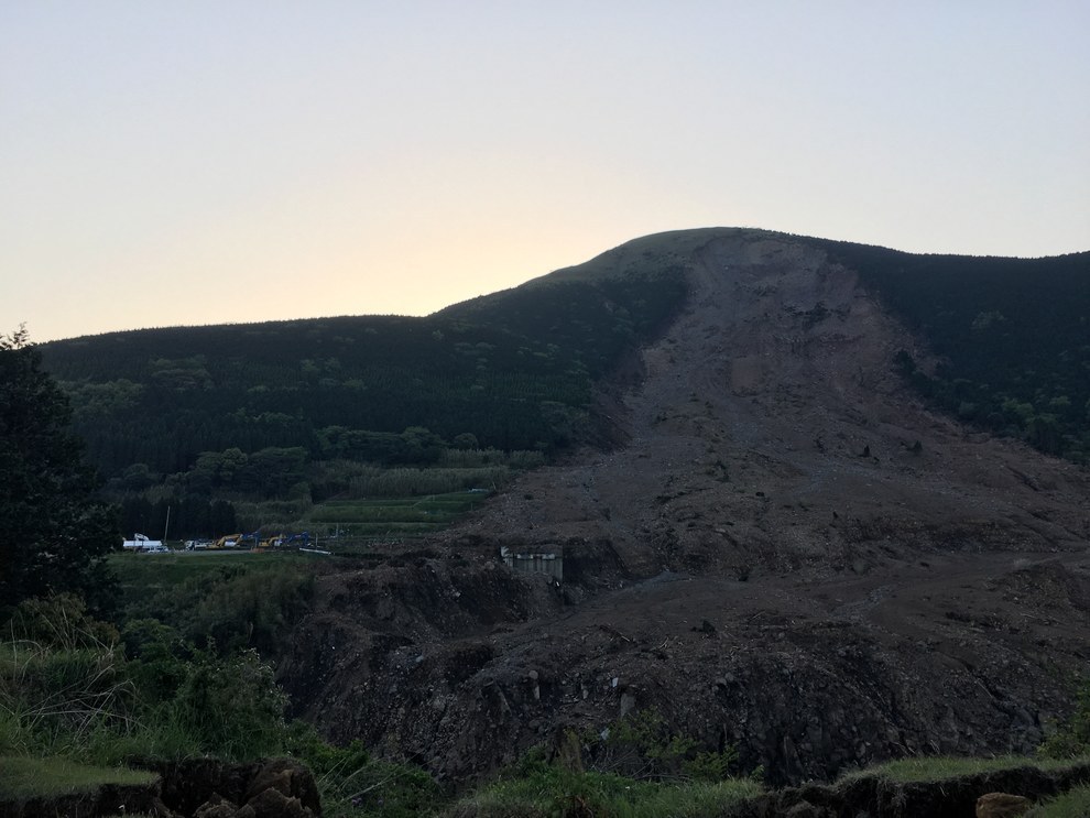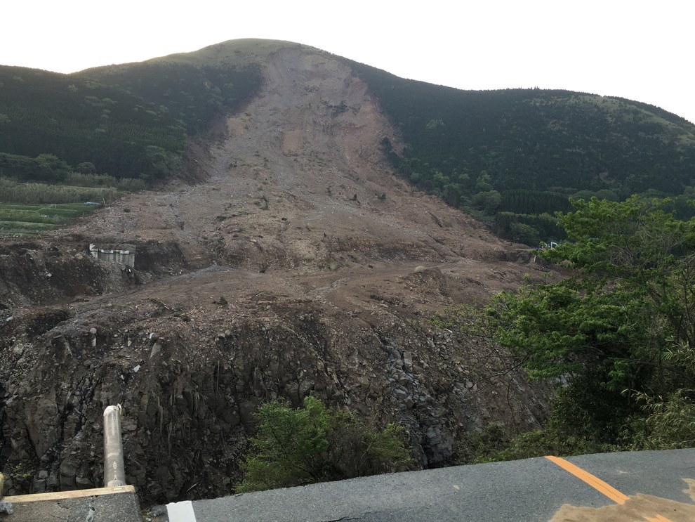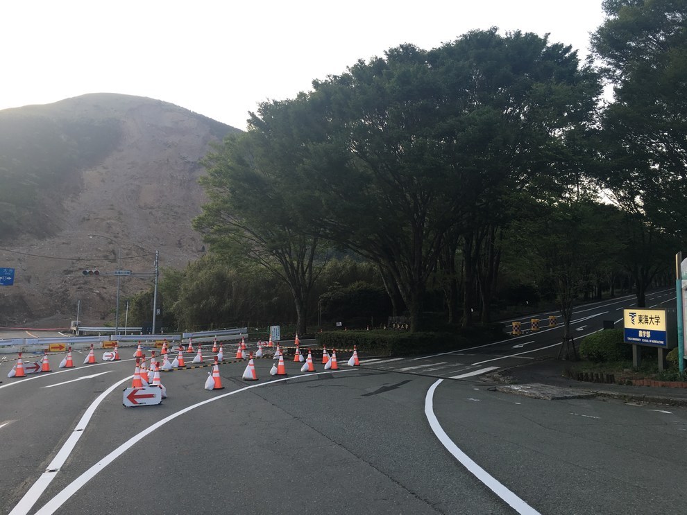 右手は、震災直後に孤立していた東海大学のキャンパス。左手には、大規模な土砂災害があった国道57号沿いの山が見える。 Daichi Ito / BuzzFeed