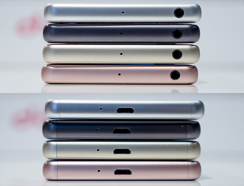 右側面(写真=上)には、カメラキーとボリュームキー、指紋センサー兼電源キー、左側面(写真=下)には、nanoSIM(4FF)およびmicroSDカードトレーがある。前機種である「Xperia Z5」シリーズではキャップを開いた奥にトレーがあったが、Xperia X Performanceはキャップと一体化したトレーになっている。