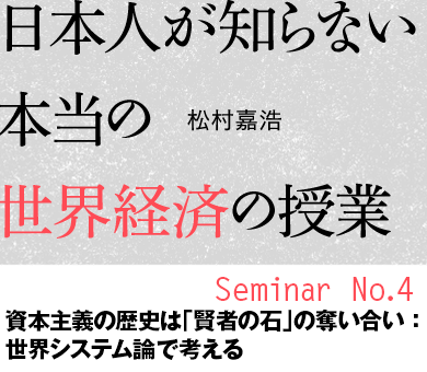 「本題に戻って《新しい時代》のお話をしましょう。我々がどういう時代にいるのかということを理解するには、我々が生きている世界がどのようにできてきたのかという過去を知らなければいけません。結論から先に言えば、資本主義の歴史は、じつは“賢者の石”の奪い合いでもあるのです。ところが、《新しい時代》に入ったというのは“賢者の石”を使い果たしてしまったということでもあるのです。私は歴史は専門ではないので、この事実を、アメリカの社会・歴史学者のイマニュエル・ウォーラーステインが提唱した近代世界システム論をベースに考えていきましょう」