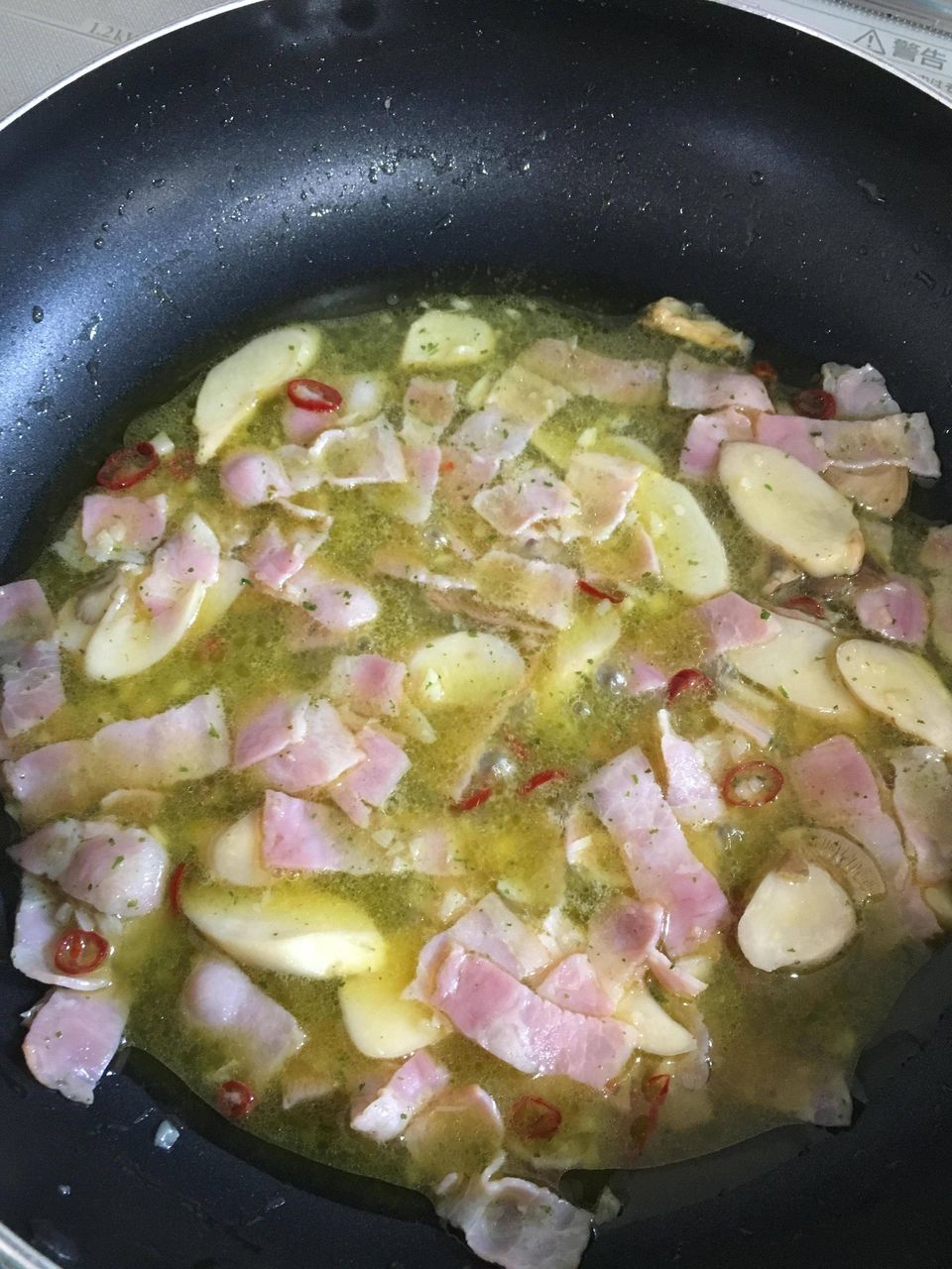 オリーブオイルは多目に、フライパンを傾けた時にニンニクが沈むくらい