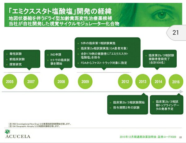 彡(゚)(゚)『第二相でポシャったアキュセラは、少なくとも2年かかる試験をやり直すか、開発を止めるか選択を迫られることになりそうやね。再度チャレンジする場合は当然ながら莫大な資金が必要になるわけだけど、どうやって調達するんだろ(棒』 pic.twitter.com/pdwcihbpYw
