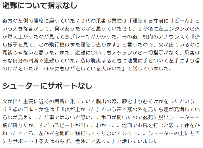 火が出た主翼に近くの場所に乗っていて脱出の際、膝をすりむくけがをしたという68歳の日本人女性は「『炎が上がった』という声で窓の外を見たら煙が充満しているのが見えた。ただ事ではないと思い、非常口が開いたので必死に脱出シューターで飛び降りたが、すごいスピードが出てこわかった。地面でお尻を打つと思って体をひねったところ、左ひざを地面に強打してすりむいてしまった。シューターの上にも下にもサポートする人はおらず、危険だと思った」と話していました。