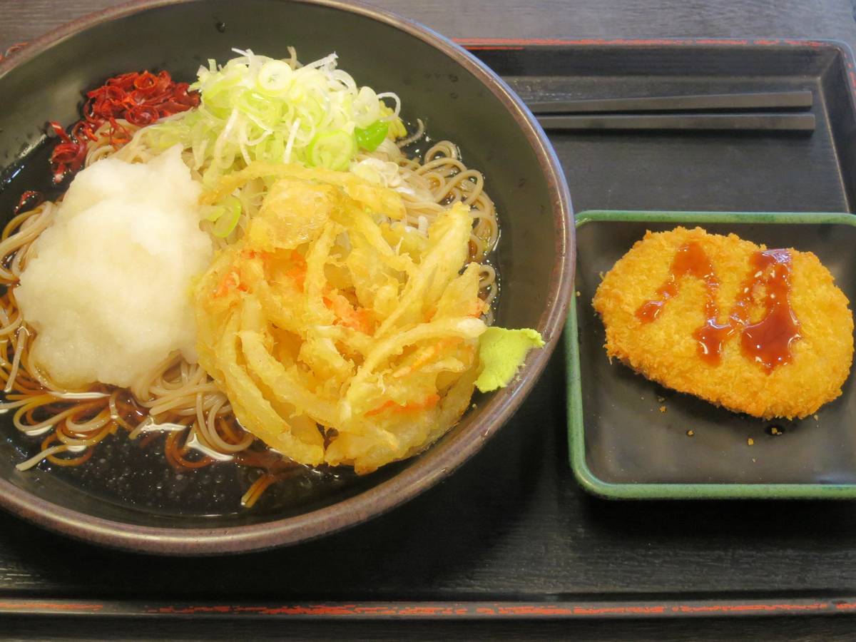 ゆで太郎代々木東口店(ホームページ)にて朝そば(おろし)330円、無料クーポンでコロッケ。