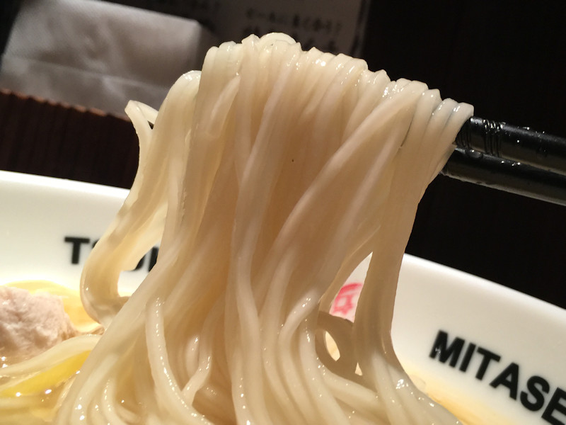 真っ白い角中細麺、麺同士がくっつきそうでくっつかず、箸で手繰ると量が多すぎてしまう。