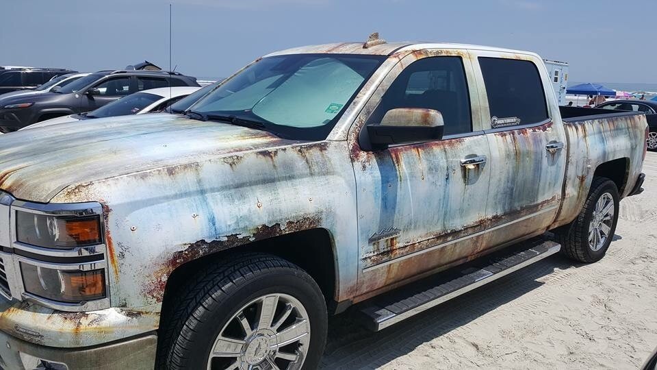 This guy painted his brand new truck to look old and rusted.