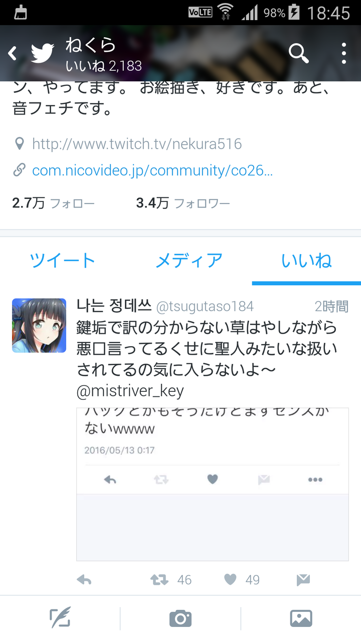 ねくら、でんちゅうのもやかわ鍵?晒し煽りツイをいいね!する
