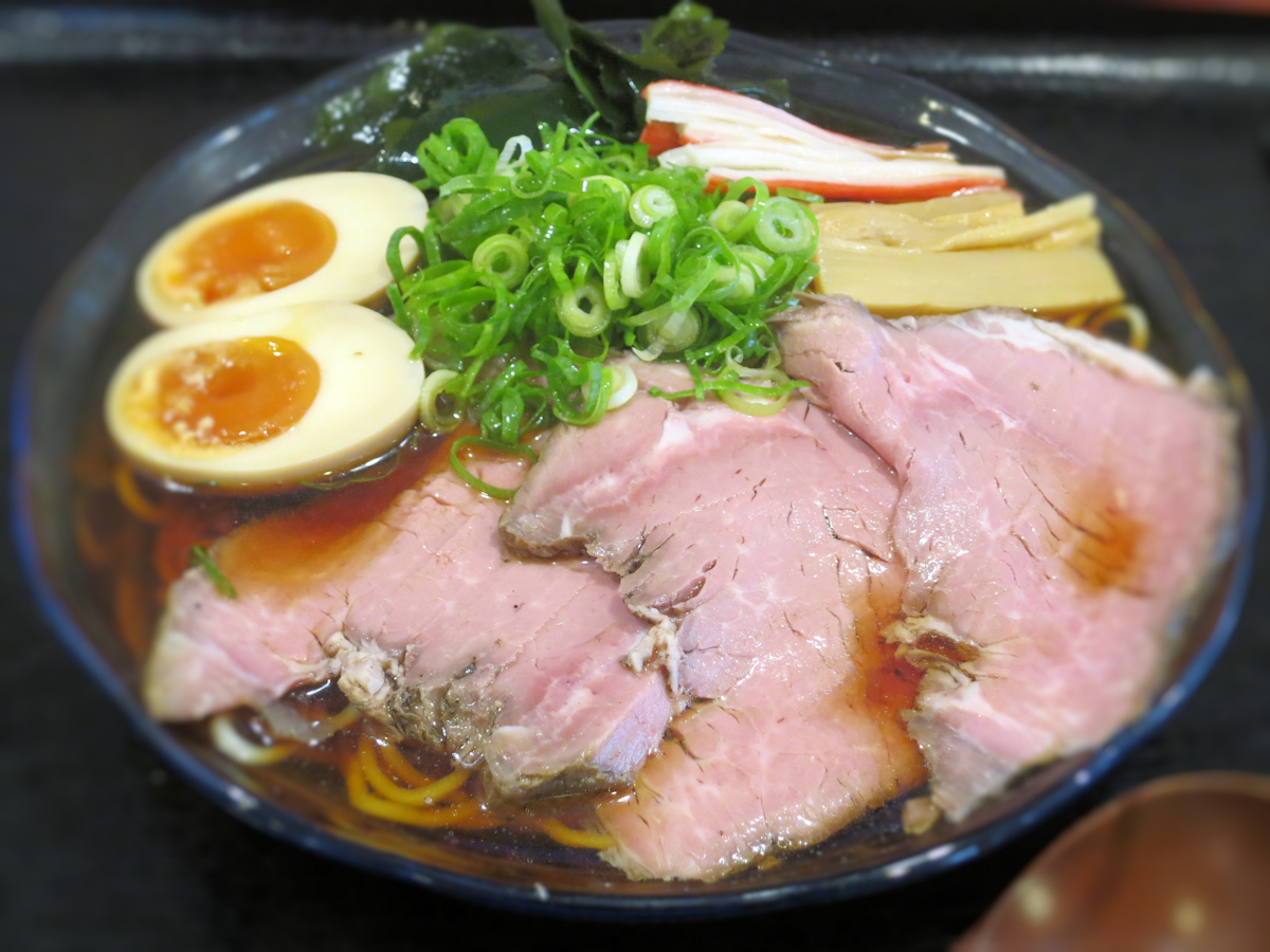 トッピングは丼の半分を覆うローストビーフ、もちろん牛肉を仕入れて店内で調理されていて、気軽に食べにくいほど厚切りで、十分な食べ応えを確保しながら冷たいスープにもとても合っています。