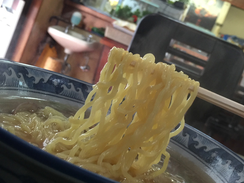麺は店内製麺室にて打つ短尺角細麺、平皿に盛り付けているので十分にスープに浸されてとても食べやすく、とても美味しい。