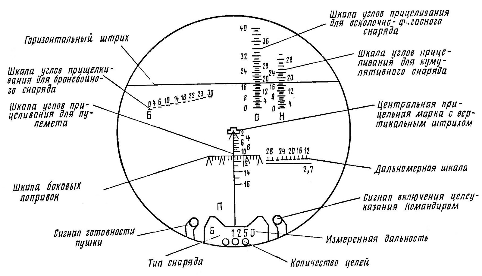 The sight includes graduations for firing the PKT machine gun to a maximum range of 1800m, for firing HE-Frag shells to a maximum range of 5000m, for manually applying lead on moving targets, and an auxiliary stadia rangefinder for manually determining the distance to a tank-type target or a bunker 2.7m in height at distances from a minimum of 500m up to 4000m (there is no need for a ballistic solution for targets closer than 500m). The stadia rangefinder is for emergency use only. On the top of the sight picture is the range indicator dial for the laser range finder, which is also capped at 4000m. Once the gunner has lased the target, the range will be displayed here. The gunner must then manually input the data into the analogue ballistic computer.