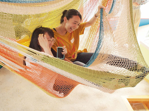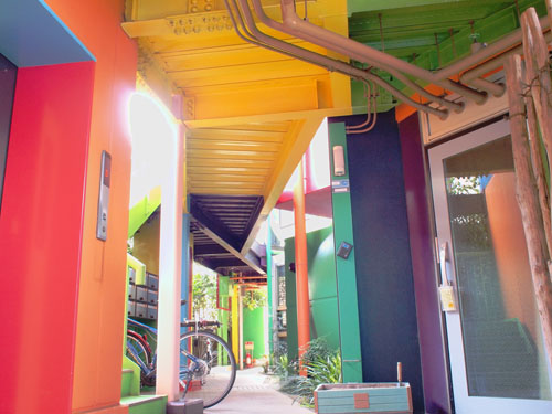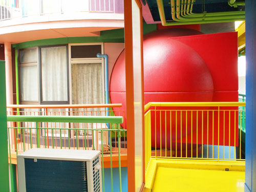 現代美術家にして建築家の荒川修作とマドリン・ギンズがデザインした全9戸の集合住宅の内外装には14色のビビッドなカラーが施され、大人の土踏まずと子どもの土踏まずの大きさに合わせて2種類の凸凹が施された床は、裸足で歩くと足裏から色々な感触が伝わってくる。