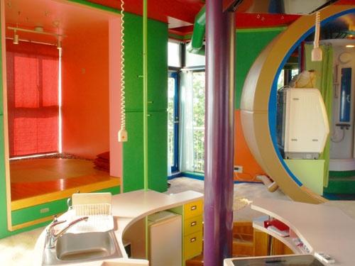外観だけでなく、間取りも特徴的だ。リビングの中心にキッチンが据えられ、トイレとシャワールームは開放型。球体の部屋や天井に取り付けられたフック、傾斜や凸凹のついた床や天井まで伸びるポールなど、まるで建物全体がアスレチック場のような構成になっている。住宅が住み手の身体へと訴えかけ、住み手の身体が主役になる家。