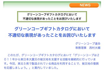 福岡県に本部がある生活協同組合連合会 グリーンコープ連合が展開する夏物ギフトカタログ。福島県以外の「東北5県」で東日本大震災応援企画を立ち上げたことが、インターネット上で批判されてきた。グリーンコープは6月14日、ホームページにおわびを掲載した。