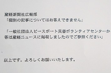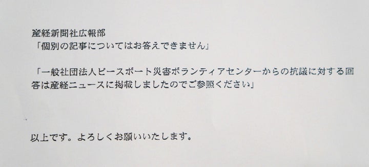 「一般社団法人ピースボート災害ボランティアセンターからの抗議に対する回答は産経ニュースに掲載しましたのでご参照ください」