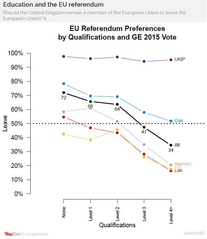 次に学歴別。どの政党を支持していても高学歴者ほど残留の支持が高く、低学歴者ほど離脱支持が高い(例外は学歴関係なく高いイギリス独立党)。レベル4+は大卒以上。高学歴のインテリ(EU支持)対低学歴者(反EU)の戦い。pic.twitter.com/2q5i9TxE0S