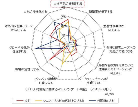 このうち、より多様な人材(女性、シニア、外国人材)の活躍促進についてのメリットとしては、人材不足の緩和と同時に、職場が活性化される、