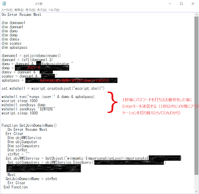 このvbsファイル、 "実行して1秒後に管理者アカウントのパスワードを打ち込んでEnterを押し、指定したbatファイルを実行する"というとてもアレなものでした。