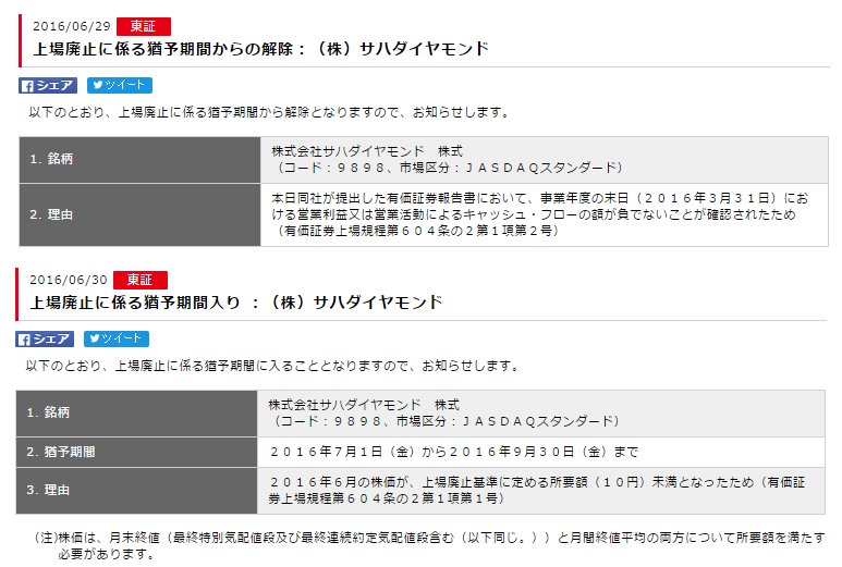 サハダイヤ 上場廃止の猶予期間解除の翌日に再び猶予期間入り pic.twitter.com/LIRPH04YKj