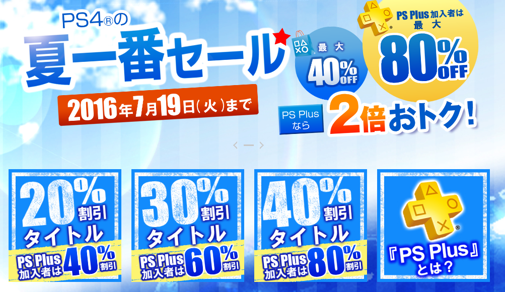 PS Storeは、本日より夏一番セールを開催した。様々な人気タイトルが20、30、40%オフに。PS Plus加入者は値引きが2倍となり、40、60、80%オフで購入が可能とのこと。