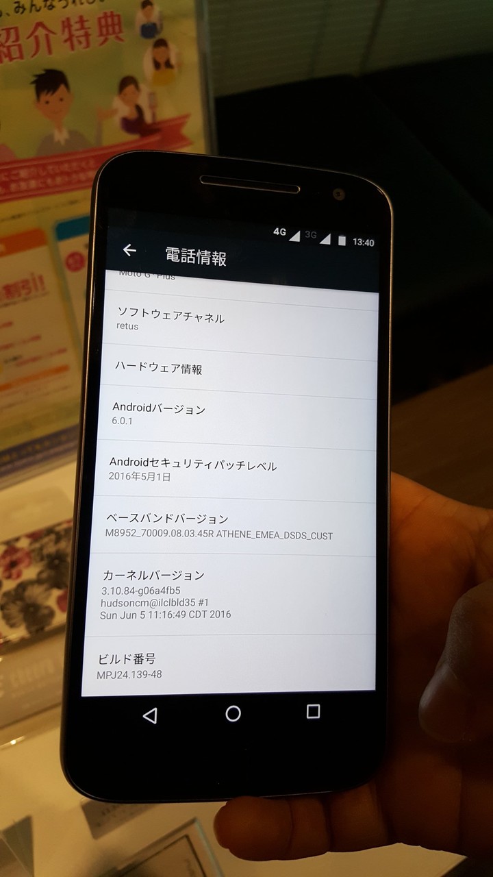 なお、展示機は型番が「XT1642」となっており、対応周波数帯は4GのFDD-LTE方式で700MHz(Band 28)および800MHz(Band 19・20)、850MHz(Band 5)、900MHz(Band 8)、1700MHz(Band 3)、2100MHz(Band 1)、TD-LTE方式で2300MHz(Band 40)、3GのW-CDMA方式で800および850、900、1900、2100MHz、2GのGSM方式で850および900、1800、1900MHzとのこと。OSはAndroid 6.0.1(開発コード名:Marshmallow)。