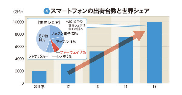 中国の通信機器大手、華為技術(ファーウェイ)の躍進が続いている。2015年12月期の連結売上高は、前年比37%増の3950億元(約6兆円)、営業利益は同33%増の458億元(約7000億円)だった(表(1))。