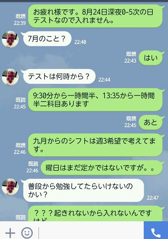¤ä¤ê¤È¤ê¤Î³µÍפϤ³¤¦¤À¡£³ØÀ¸¤Ï¡¢ÍâÆü¤Ë¥Æ¥¹¥È¤¬¤¢¤ë¤¿¤á¿¼Ìë0»þ¤«¤éÄ«5»þ¤Þ¤Ç¤Î¥·¥Õ¥È¤ËÆþ¤ì¤Ê¤¤¤³¤È¤òʦLINE¤ÇÅÁ¤¨¤¿¤¬¡¢¼Ò°÷¤Ï¡Ö9-14¤Î¥·¥Õ¥È¤Ç9»þȾ¤«¤é¥Æ¥¹¥È¤À¤«¤é¹Ô¤±¤Ê¤¤¤ó¤Ç¤¹¤Ã¤Æ¤Î¤Ê¤é¤ï¤«¤ë¤±¤É¡¢¤½¤ì¤Ç0-5½Ð¤ì¤Ê¤¤¤Ã¤Æ¤Î¤¬°ÕÌ£¤¬¤ï¤«¤é¤Ê¤¤¡×¤ÈÊÖ¿®¡£¤µ¤é¤Ë¤Ï¡Ö¿²¤Ê¤±¤ì¤Ð¤¤¤¤¤¸¤ã¤ó¡×¡Ö¤½¤Î¤Þ¤Þ¡¢5¥¢¥Ã¥×¸å¡¢ÊÙ¶¯¤·¤¿¤é¤¤¤¤¤¸¤ã¤ó¡×¤È¤¤¤¦¶Ã¤¤Î¸ÀÍÕ¤òÁ÷¤Ã¤Æ¤¤¤ë¡£