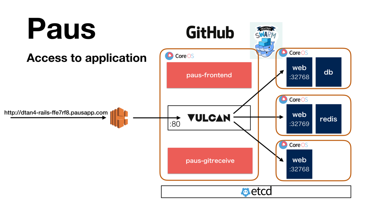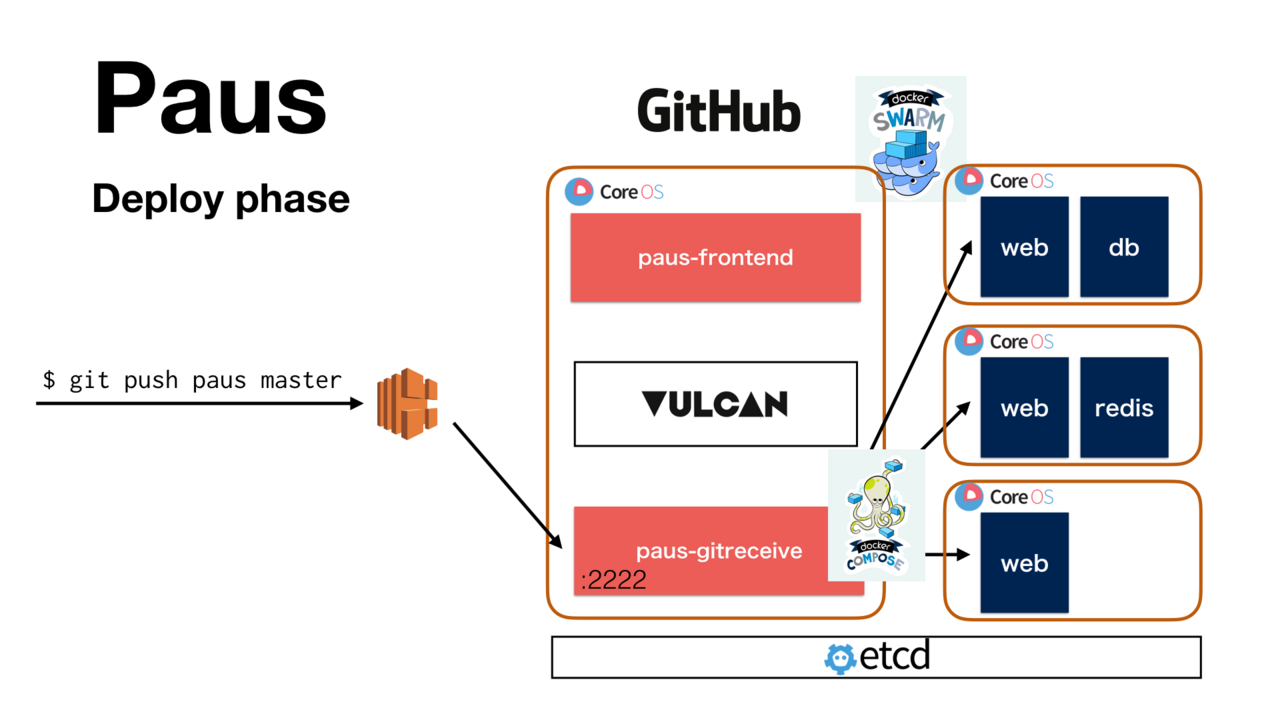Paus への git push は、paus-gitreceive モジュールが受け取ります。paus-gitreceive は受け取ったリポジトリの中身を展開し、Docker イメージのビルド (docker-compose build) とコンテナの起動 (docker-compose up) を行います。前述したように、Docker Compose は Docker Swarm クラスタ上で一連の作業を行います。