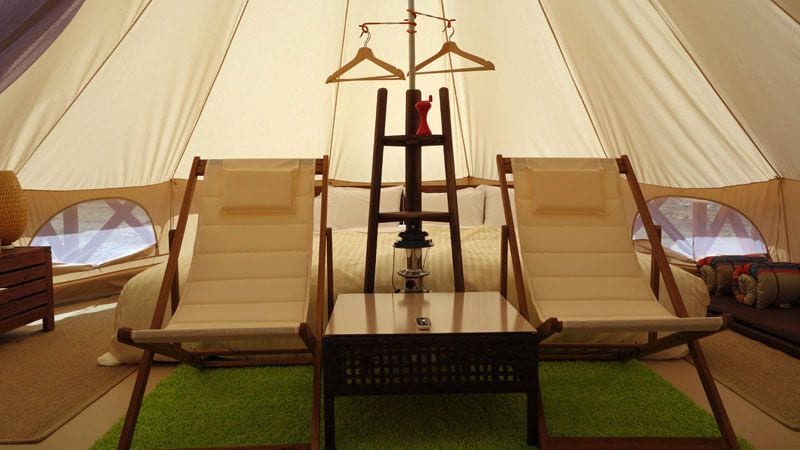 このキャンプ場は、いわゆる「グランピング」に分類される。グランピング(glamping)とはglamorous(グラマラス)とcamping(キャンピング)を合わせた言葉。2005年頃に英国で始まったとされる。宿泊は常設テントやコテージ、トイレやシャワー、食事はホテル並のサービスを備えている施設が一般的だ。