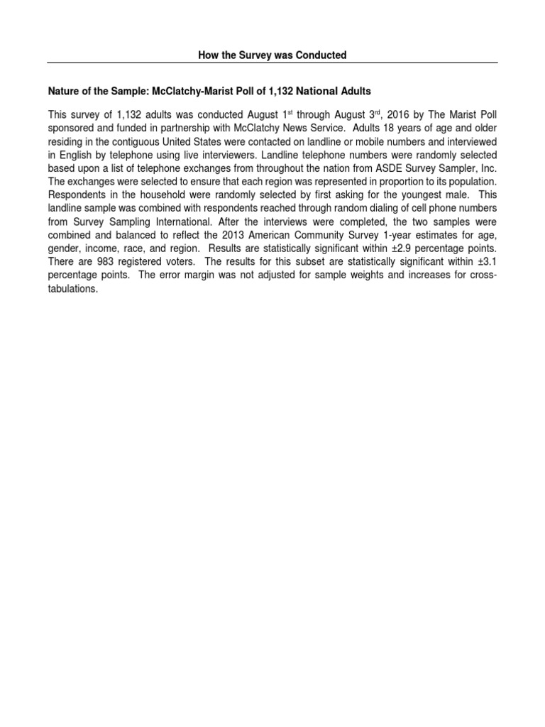 , 2016 by The Marist Poll sponsored and funded in partnership with McClatchy News Service. Adults 18 years of age and older residing in the contiguous United States were contacted on landline or mobile numbers and interviewed in English by telephone using live interviewers. Landline telephone numbers were randomly selected based upon a list of telephone exchanges from throughout the nation from ASDE Survey Sampler, Inc. The exchanges were selected to ensure that each region was represented in proportion to its population. Respondents in the household were randomly selected by first asking for the youngest male. This landline sample was combined with respondents reached through random dialing of cell phone numbers from Survey Sampling International. After the interviews were completed, the two samples were combined and balanced to reflect the 2013 American Community Survey 1-year estimates for age, gender, income, race, and region. Results are statistically significant within ±2.9 percentage points. There are 983 registered voters. The results for this subset are statistically significant within ±3.1 percentage points. The error margin was not adjusted for sample weights and increases for cross-tabulations.