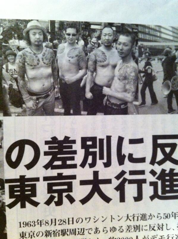 哀れネトウヨ死出の旅“ドンジャンドンジャン死出の旅” 708:名無しさん@13周年 2013/09/29(日) 01:20:18.84 ID:YqE1KY9y0今日発売の「週刊金曜日」東京大行進の記事より、入れ墨を入れた「男組」。