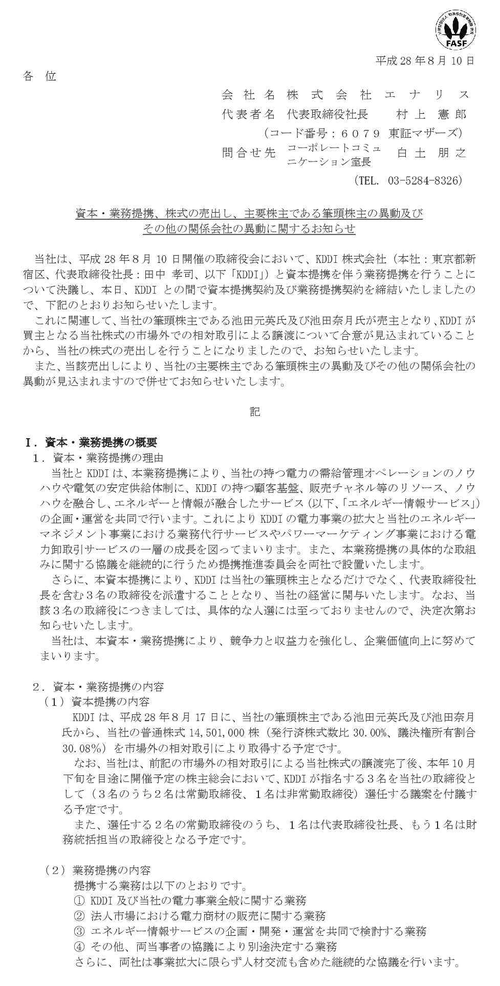 ※KDDIとの資本業務提携により上場廃止リーチから脱出できそうになっても、頑なに昔の肩書で押し通すエナリスの村上憲郎社長